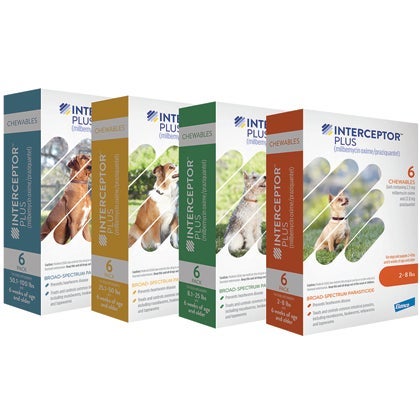 Interceptor Plus-is a monthly chew that protects dogs and puppies 6 weeks or older and 2 pounds or greater against heartworm disease, adult hookworm, roundworm, tapeworm and whipworm infections.
